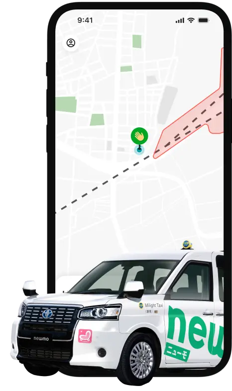 「newmo(ニューモ)」は、スマホ一つで近くにいるタクシーを手軽に呼べる、