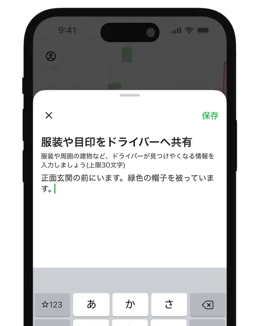 ドライバーとの待ち合わせをスムーズにするために、事前に服装や目印についてメモを残せる機能があります