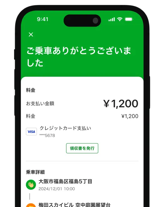 タクシー配車アプリです。配車依頼から支払いまで、すべてがスマホ一つで完了します。